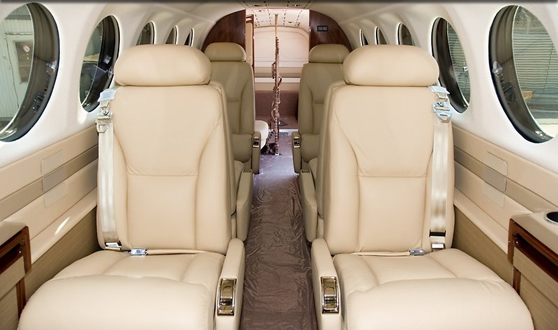 Beech King Air 350 es el mayor turbohélice y el más reciente de los de la gama de King Air, que resulta sumamente popular. Su comodísima cabina presurizada puede transportar hasta nueve pasajeros, normalmente distribuidos en dos grupos de cuatro más un noveno asiento enfrente de la puerta. Este avión combina una gran autonomía y una comodidad que podrían competir con algunos jet privados pequeños.